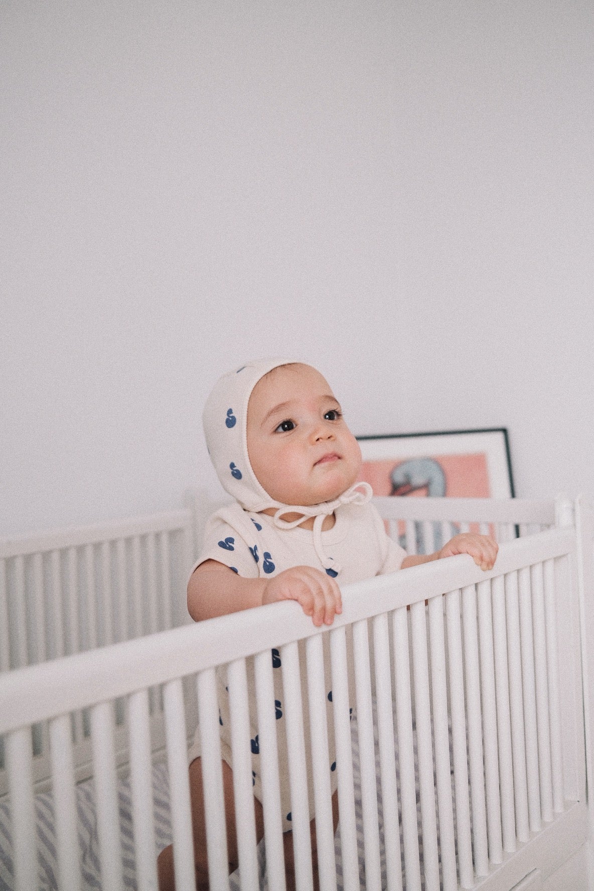 表面にワッフルの様な凹凸があるふわふわのオーガニックコットンの生地に大きめのブルーのドットをプリントした生地。まるでブルーベリーがのったワッフルのよう。
