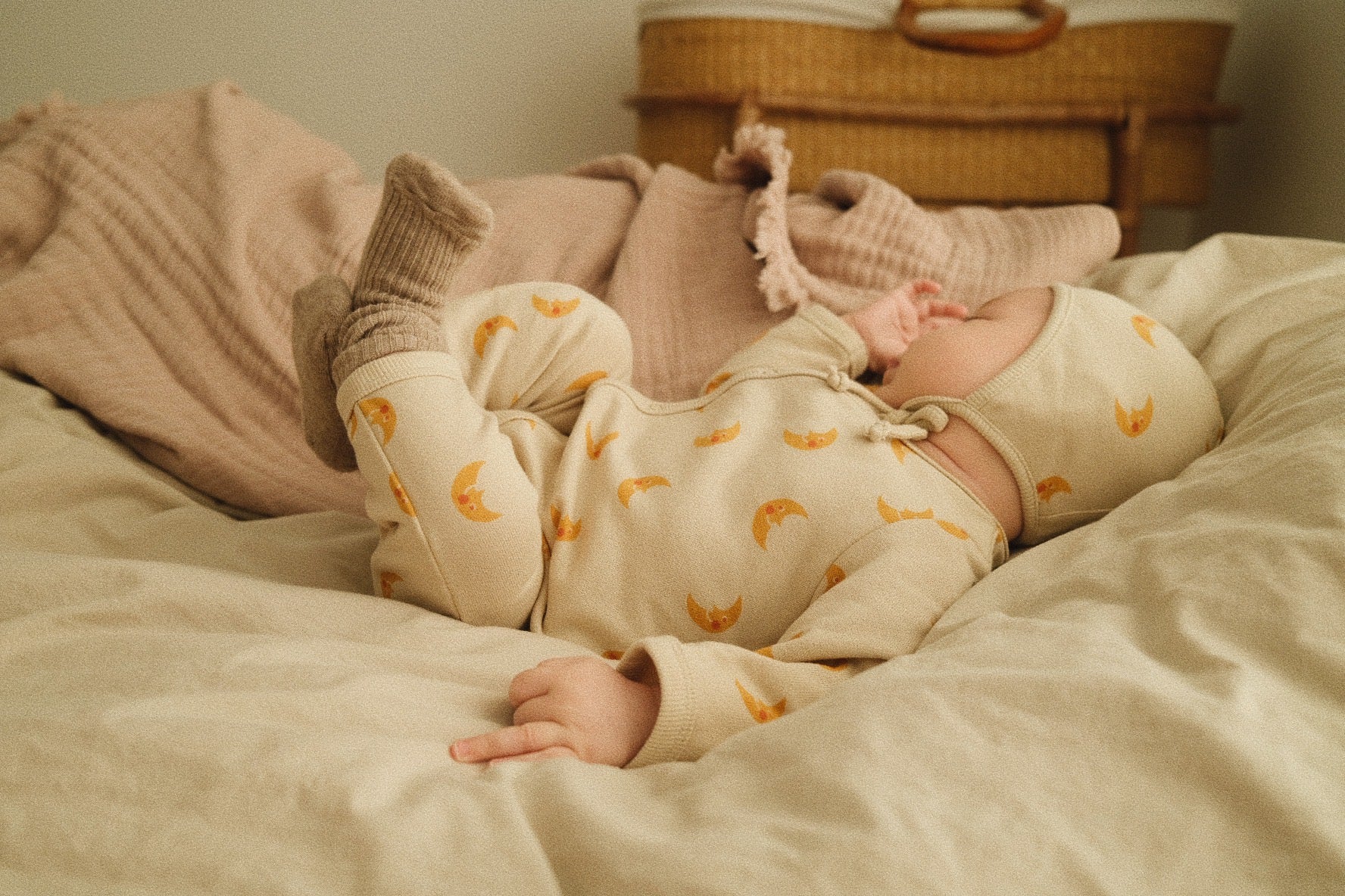 ベージュの空ににっこりと浮かぶお月様かを描いた心地よい生地。