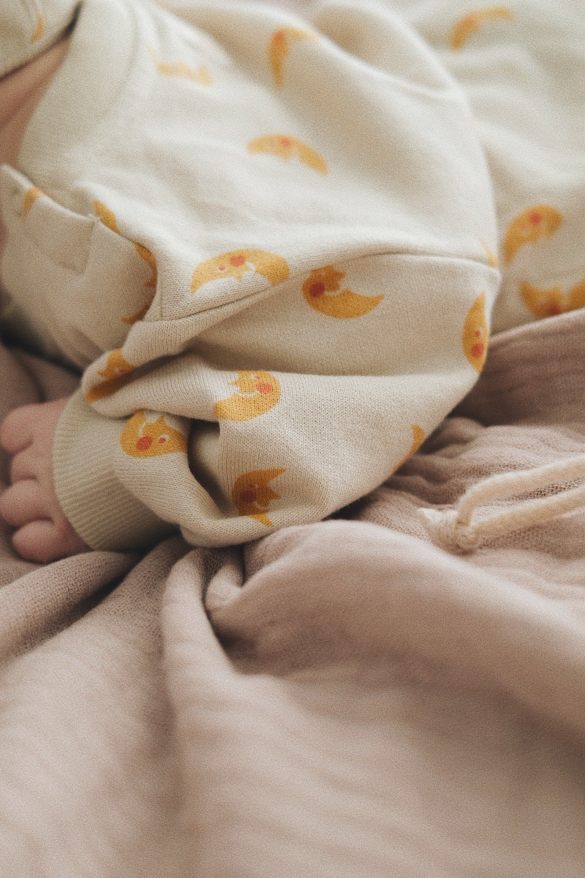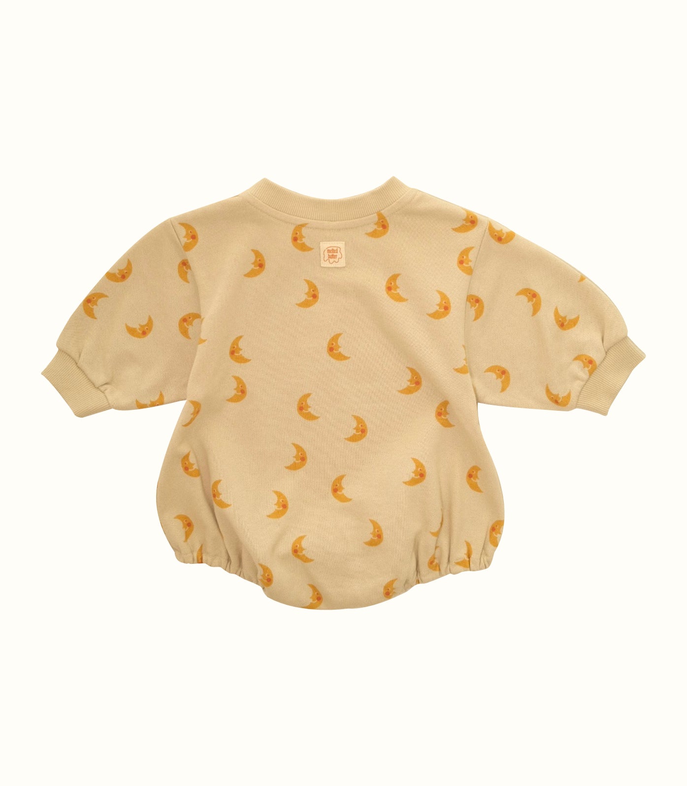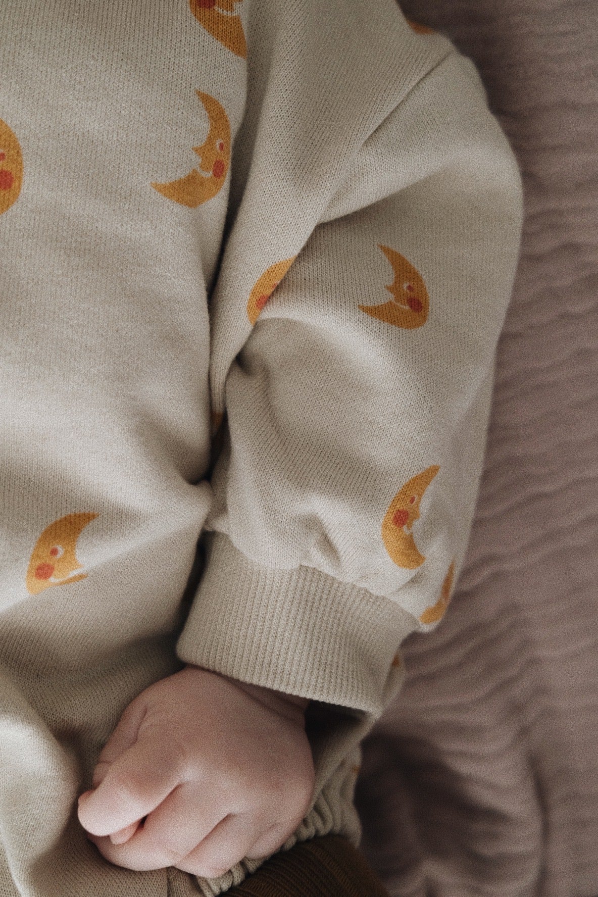 ベージュの空ににっこりと浮かぶお月様かを描いた心地よい生地。