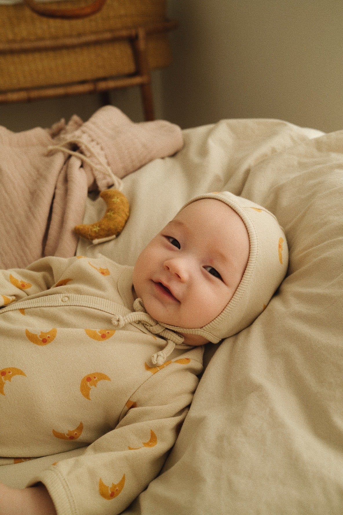 ベージュの空ににっこりと浮かぶお月様かを描いた心地よい生地。